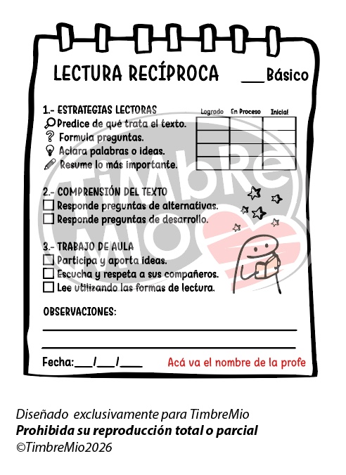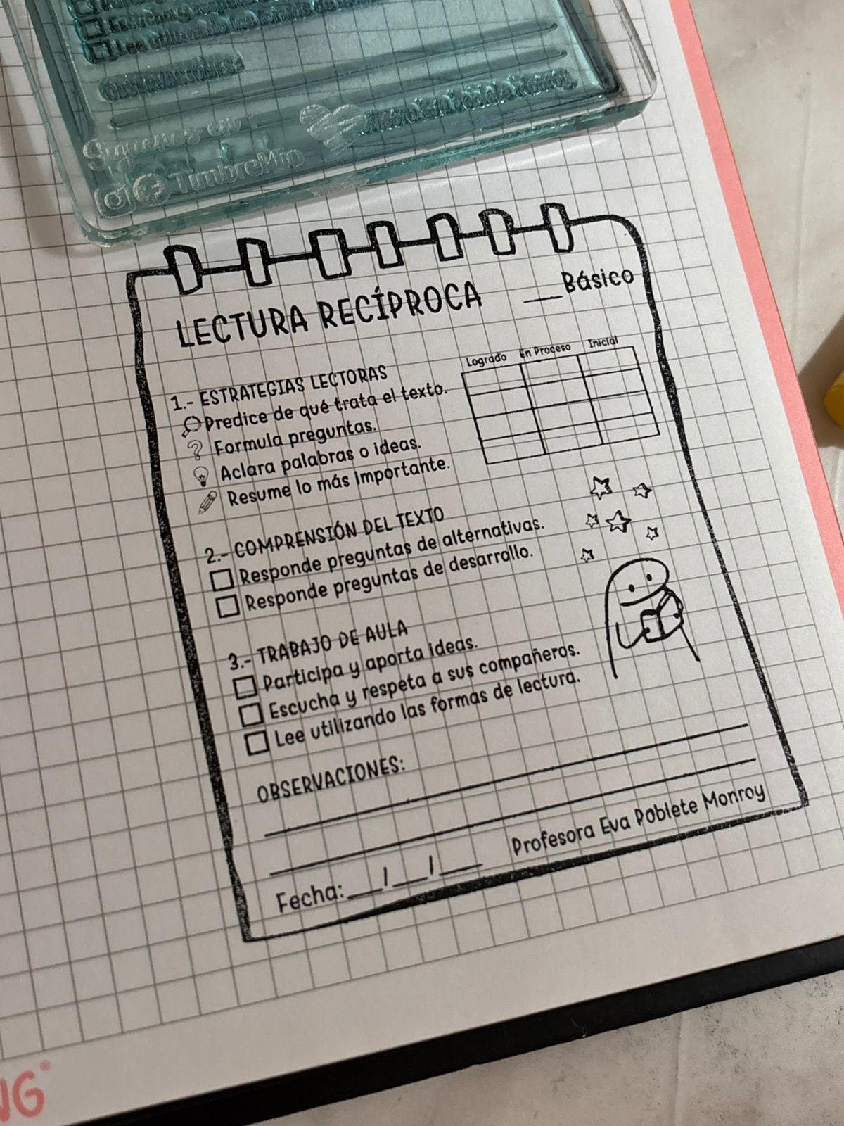 ESTE TIMBRE ES CREACIóN DE LA PROFE EVA POBLETE Y NOS LO REGALó PARA QUE USTEDES TAMBIéN PUEDAN USARLO. ESTE TIMBRE SE UTILIZA EN UNA ESTRATEGIA PEDAGóGICA DIARIA EN EL COLEGIO DE EVA, LA ACTIVIDAD SE LLAMA LECTURA RECíPROCA, TODOS LOS DíAS INDEPENDIENTE DE LA ASIGNATURA SE REALIZA ESTA ACTIVIDAD Y SE TRATA DE REFORZAR PRáCTICAS DE LECTURA, ESTE TIMBRE SIRVE PARA PODER EVALUARLAS Y VER LOS AVANCES DE LOS ESTUDIANTES COMO TAMBIéN HACER UNA BUENA RETROALIMENTACIóN DE LA PRáCTICA. NO INCLUYE ALMOHADILLA CON TINTA, TE RECOMENDAMOS AL ALMOHADILLA DE MARCA ARTLINE DE 13X8 CMS DISPONIBLE EN LA WEB. UNA VEZ QUE COMPRES, TE ENVIAREMOS CORREO SOLICITANDO TU NOMBRE.