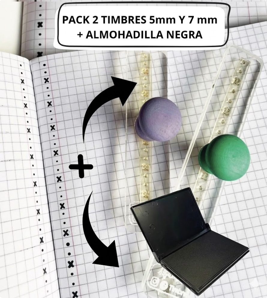 PACK PROFE 2 TIMBRES PUNTO PUNTO CRUZ (5 MM Y 7 MM) + 1 ALMOHADILLA NEGRA METODO MATTE - NUEVO