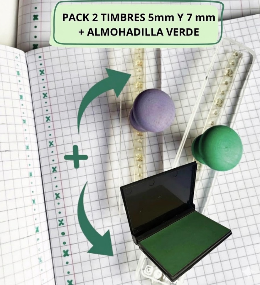 PACK PROFE 2 TIMBRES PUNTO PUNTO CRUZ (5 MM Y 7 MM) + 1 ALMOHADILLA VERDE METODO MATTE - NUEVO